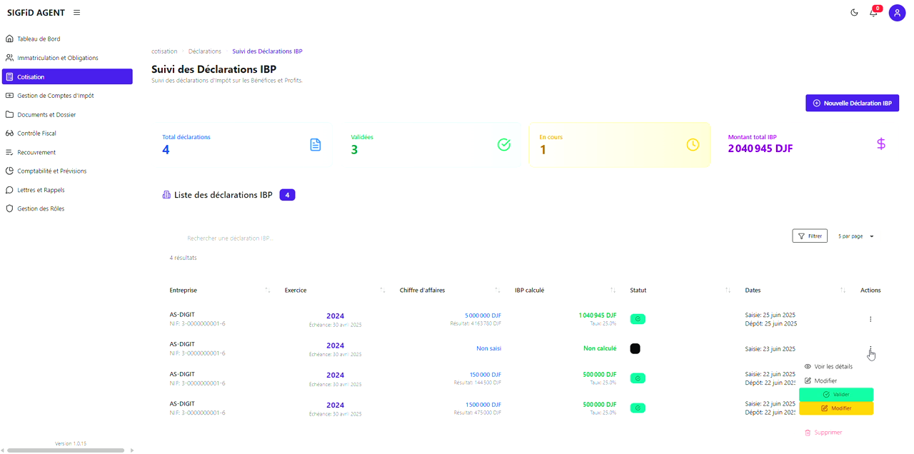 | Liste des déclarations | Entreprise & NIF • Exercice • Chiffre d’affaires • IBP calculé • Statut • Dates • Actions |