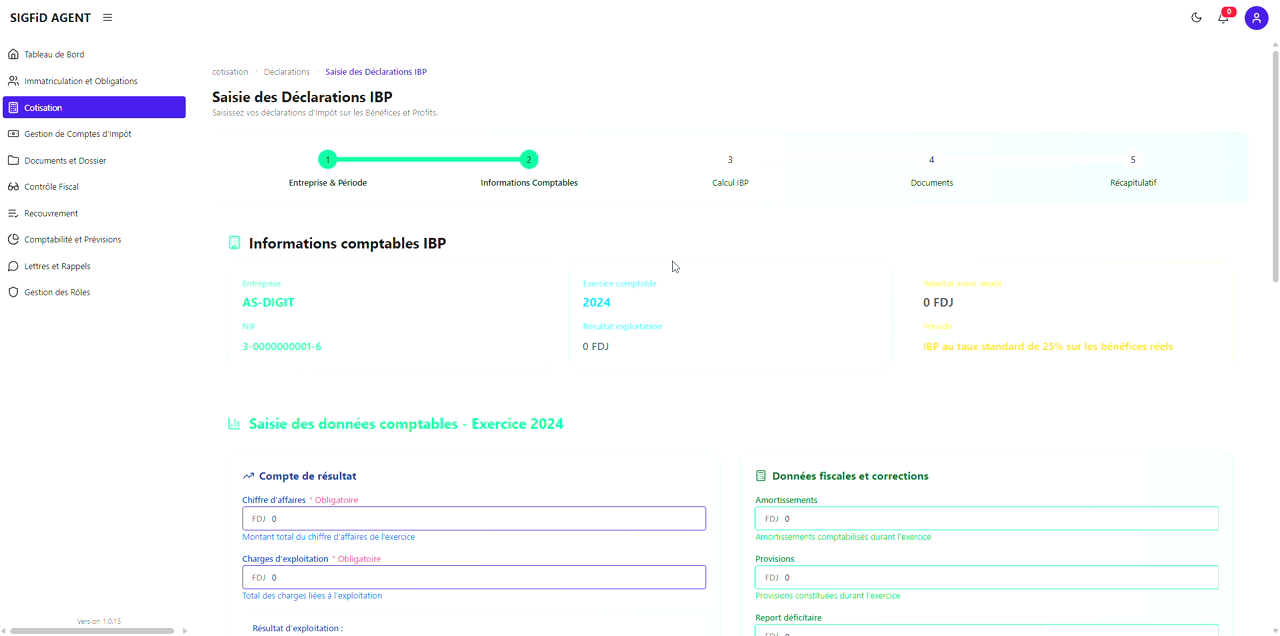 | Bandeau de progression | 5 étapes : Entreprise & Période → Informations comptables → Calcul IBP → Documents → Récapitulatif |